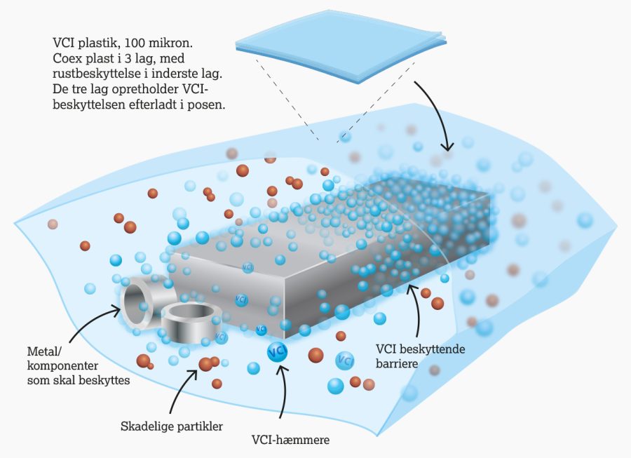 Plasten er unikt designet med et indvendigt lag, der indeholder aktive VCI-hæmmere. Når et metalprodukt pakkes i posen, dannes et beskyttende lag, som passiviserer metaloverfladen. De ydre lag hjælper med at holde beskyttelsen i tasken. Resultatet? Langtidsbeskyttelse mod korrosion under både transport og opbevaring, som ikke kræver nogen rengøring, når komponenter eller metaldele skal anvendes.