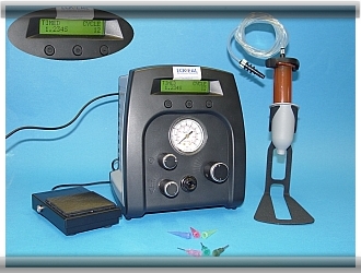 Bilden intill visar ett elektro pneumatiskt system DE1 Electro Pneumatisk Doserings utrustning som är tidsstyrt. Doseringen aktiveras av fotpedal eller av en metallindikerings kontakt.