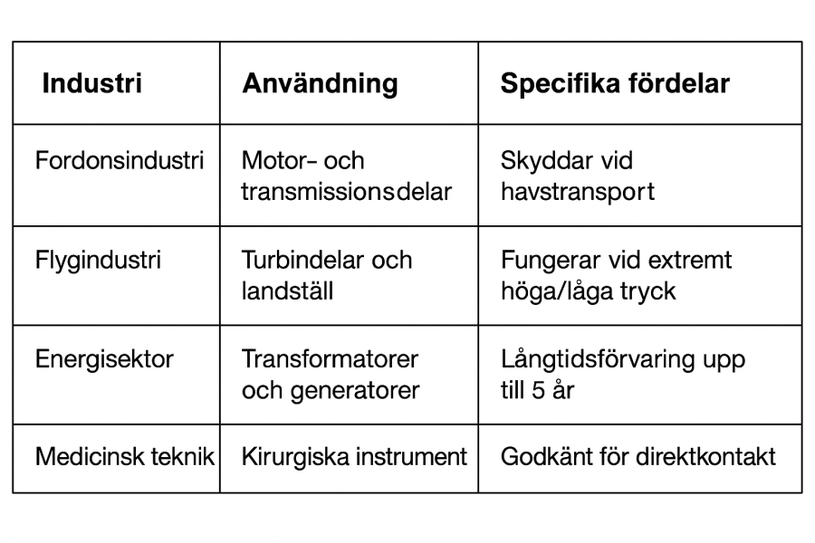 - Kondensation: Molekylerna fäster på alla metallytor och bildar en molekylär skyddsfilm.